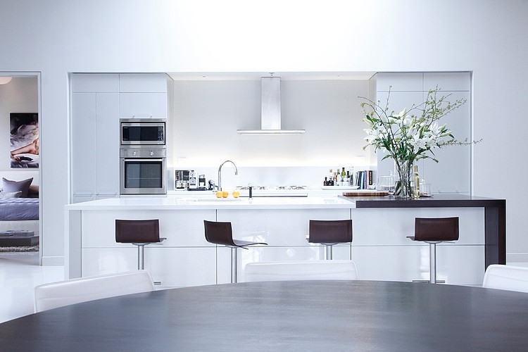 Interior designer Julie Charbonneau redesigned this 3,250 square feet penthouse located in Montreal, Canada. She kept the structure as true to its original state as possible, including the concrete columns and brick walls.