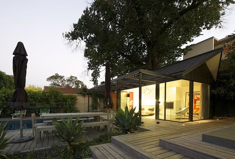 This modern minimalistic pool house designed by Artillery is located in Victoria, Australia. The interior features extraordinary furniture and art pieces accumulated by the owners making the space feel lived in and loved.