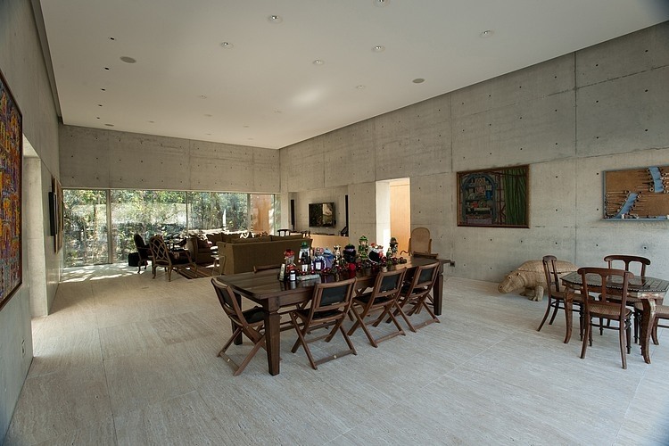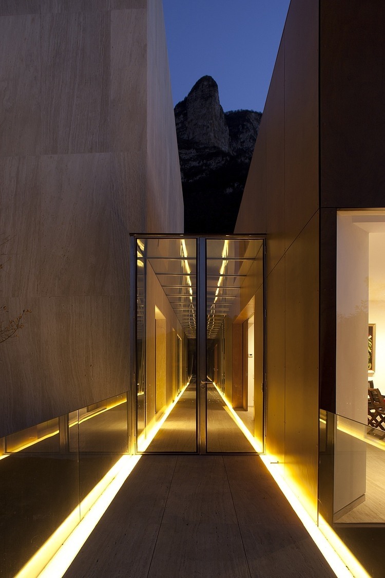 The house is located in San Pedro Garza García [in northern Mexico] in a partially-wooded area that has recently been developed in 10,000 square-meter lots and with stringent environmental protection regulations. The rocky and varied topography inspired the project to be developed in a series of boxes that flow between the contours and the surrounding vegetation. The varied layout is linked through a series of textures and independent patios, creating an interplay of light and shadow and sheltering the house from the region’s extreme climate.