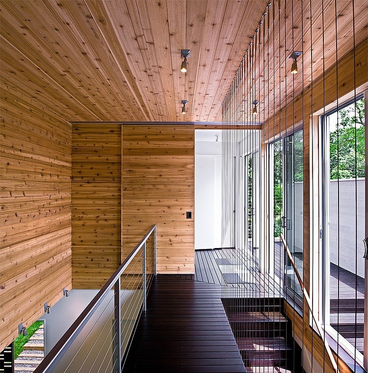 Continuing up the stair to the second floor, the final destination is the master suite and balcony. The master bedroom is connected to the bath by a bridge overlooking the public spaces below which are lit by the glazed stair wall. Lined with a guardrail of stainless steel cables recalling a fly loft and catwalk, the path culminates in the master bedroom with its wall of glazing overlooking the water.