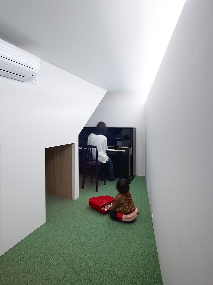 The 3rd floor, in which the bed room and child’s room are positioned, has a ceiling shaped like an attic due to building regulations. Above the child’s room is a small rooftop space, added at the strong request of the client. From the rooftop, one can view the annual fireworks display.