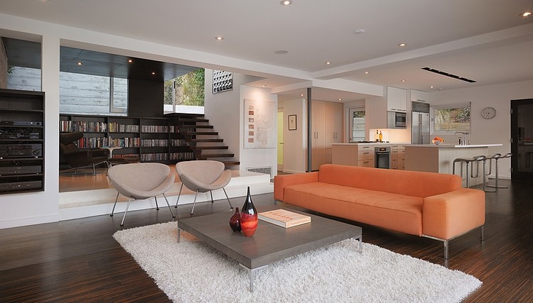This 2,000 sq.f. residence has views over Hollywood and out to the Pacific Ocean. Through relatively simple interventions, we were able to effect a complete transformation of the existing house. By removing only four interior walls at the ground floor, relocating a stair, and adding 2 rooms stacked on top of each other; we extended the interiors and created an open living space. Additionally, natural light and views were enhanced to maximize the apparent volume of space, blurring the relationship between interior and exterior and connecting the front and rear yards. The intervention of two over-sized window boxes which are large enough to stand in, create a new front façade, while providing a dramatic extension of the master bedroom suite and views to the City and ocean beyond. The window boxes cantilever to above a front courtyard behind an existing garden wall and create an overhang for the new entry. A stair is added that ascends a half-flight through the raised library to a landing connected to the backyard, and then switches back to arrive at an upper, sky-lit landing at the bedrooms above. The stair becomes a new central element connecting the stepped spatial volumes of the residence to the site, while simultaneously acting as an internal vertical courtyard that brings natural light and ventilation into the open center of the house. The vertical movement of the residence culminates at the roof via a submarine-like ladder through a skylight to provide the owner with a secret rooftop deck that affords views of Hollywood and the Pacific Ocean beyond. An elegant palette of minimal, black and white materials serves to enhance the illusion of open and expansive space. The library is a room within a room, and this effect is enhanced by a material inversion; the living room has ebony, fired oak floors and a white ceiling, while the elevated library has a white epoxy resin floor with an ebony oak ceiling. The contrasting palette creates an interlocking condition which yields an apparent expansion of the space.