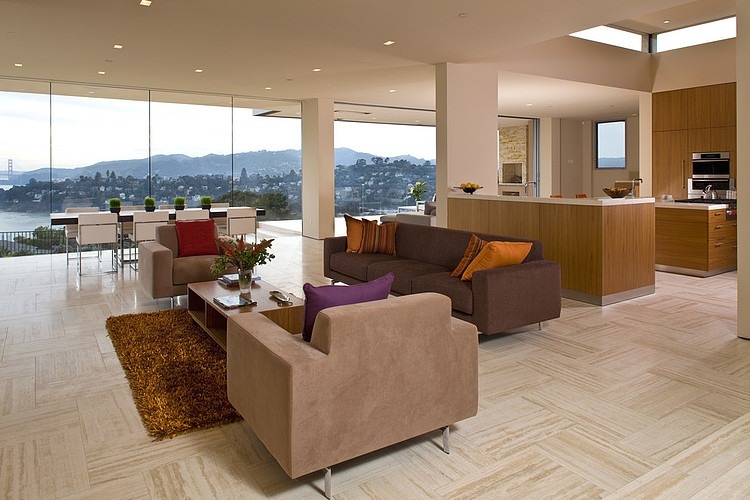 The progression of space begins with a low, compressed entry, leading to a higher circulation spine. Bathed in light from clerestory windows and skylights, the spine overlooks a new living, dining and kitchen ‘pavilion’, and new south-facing terraces, with world-class views of San Francisco Bay beyond. Frameless glazing and dramatic cantilevered roof extensions seamlessly connect interior space to exterior space, blurring the boundary between the two.