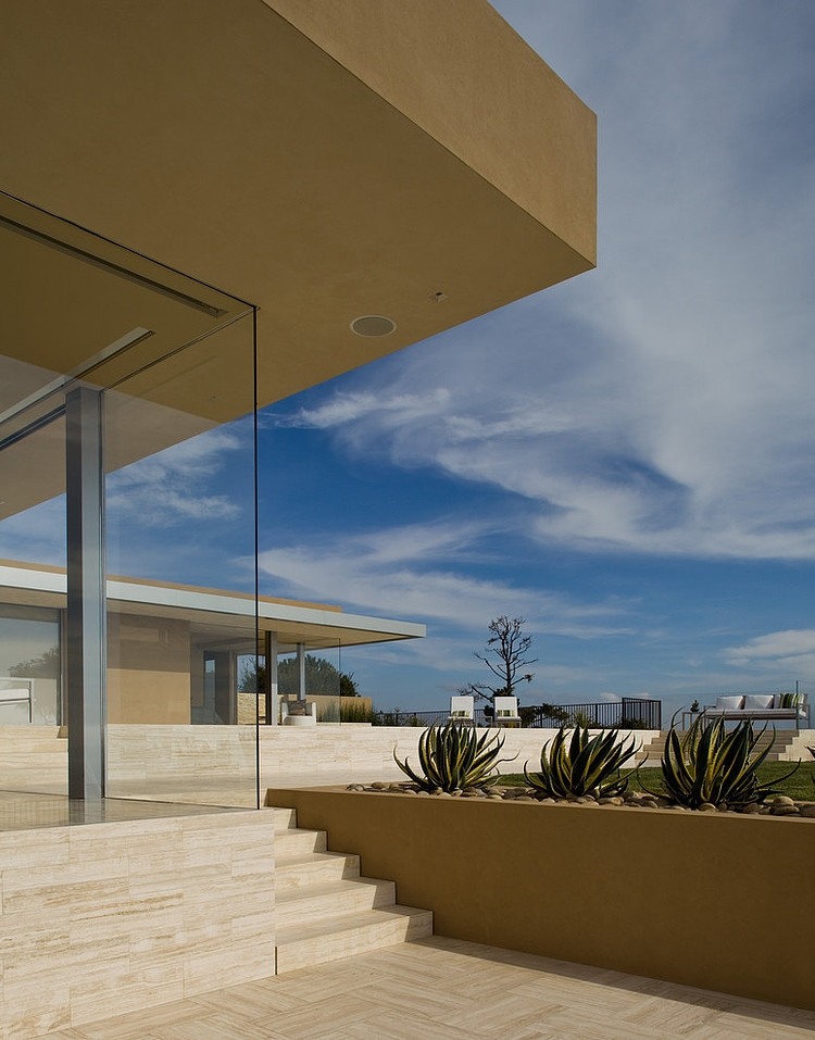 The site is a half-acre south-facing hillside parcel, with unobstructed views of San Francisco Bay to the south, east and west. Responding to the physical conditions of the site, the new house is almost entirely opaque on the north side where a new entrance motor court is defined by a rhythm of five ‘free-standing’ stone-clad walls. Slivers of glass separate the stone panels, creating a strong rhythm while giving little hint of the extraordinary spaces and views on the other side.