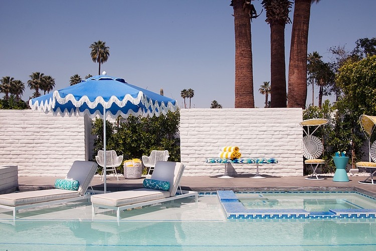 Located off the renovated pool, the 5th bedroom was converted to a Cabana Room. The backyard living area was expanded to include a new firepit and BBQ area with planters for the mature palm trees. Both the interior and exterior were updated and customized to maintain the integrity of the home built in 1969, while the color saturated interiors bring the esthetic to the present.