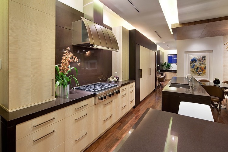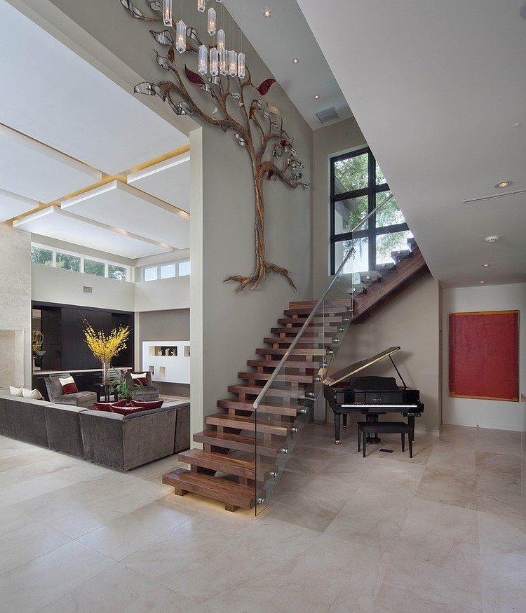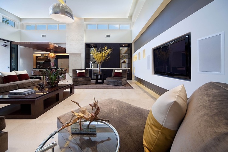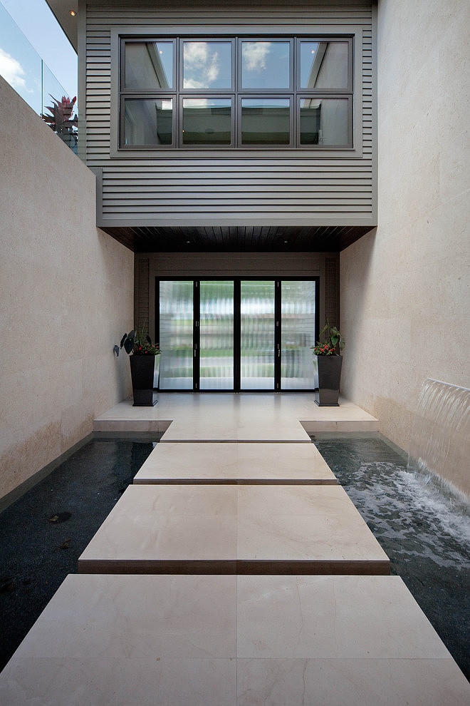 This contemporary home features clean lines and extensive details, a unique entrance of floating steps over moving water, attractive focal points, great flows of volumes and spaces, and incorporates large areas of indoor/outdoor living on both levels.