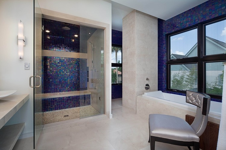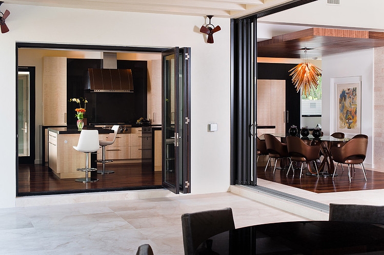 Taking aging in place into consideration, there are master suites on both levels, elevator, and garage entrance. The home’s great room and kitchen open to the lanai, summer kitchen, and garden via folding and pocketing glass doors and uses a retractable screen concealed in the lanai. When the screen is lowered, it holds up to 90% of the home’s conditioned air and keeps out insects. The 2nd floor master and exercise rooms open to balconies.