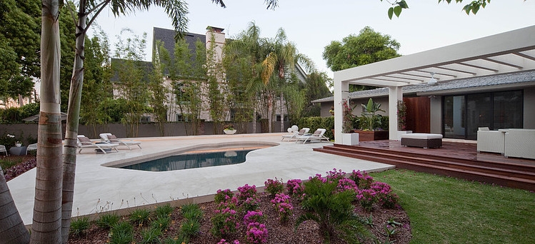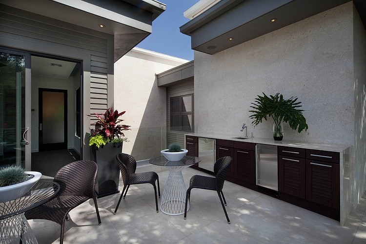 The challenge was to connect the main home to the existing guest house which was accomplished with a center garden and floating step walkway which mimics the main home’s entrance. The garden features a fountain, fire pit, pool, outdoor arbor dining area, and LED lighting under the floating steps.