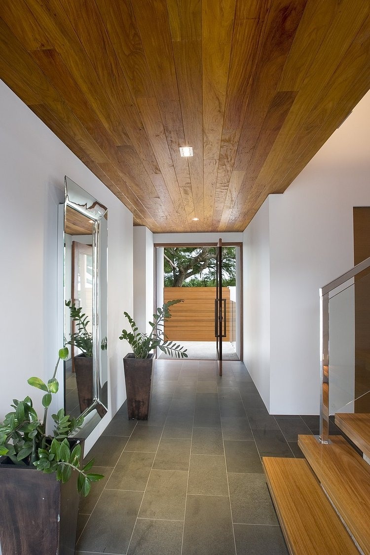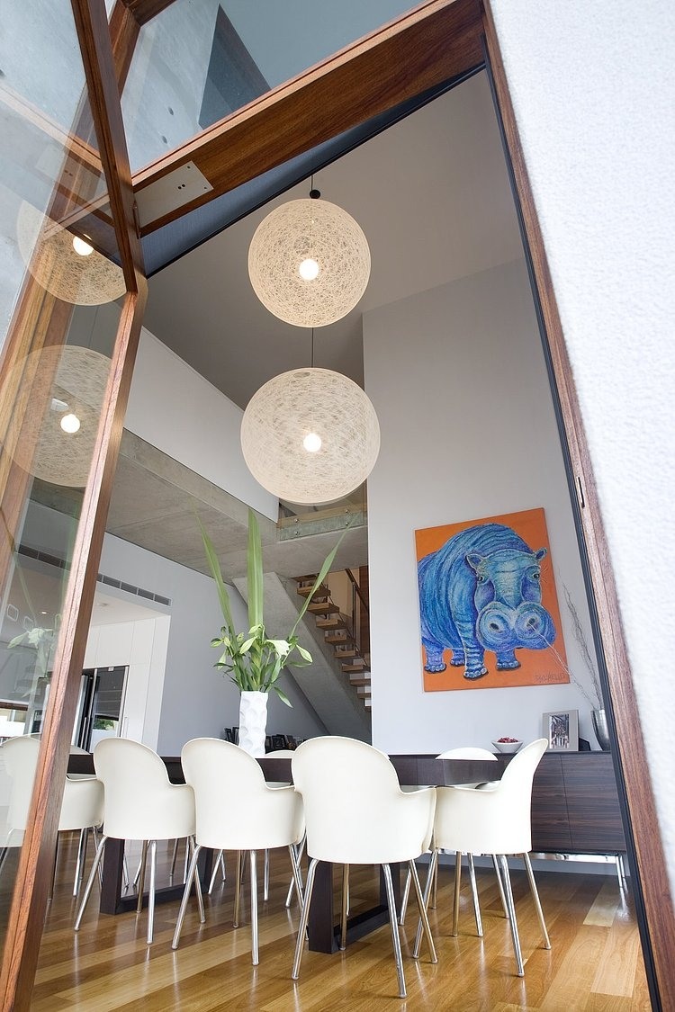 This residence was a chance for the architect to experiment and play with fresh ideas. Aiming to exploit natural lighting and impeding views, cross ventilation to the South was also a priority. An open plan maximising entertaining spaces was preferred to cater for regular gatherings. Exploration of materials and finishes, including the use of off-form concrete and heavy stucco render, are in contrast with warm New Guinea rosewood cladding on the exterior. Presenting itself as a clean, contemporary design, visitors are made aware of the mixture of chosen distinct materials from street front.