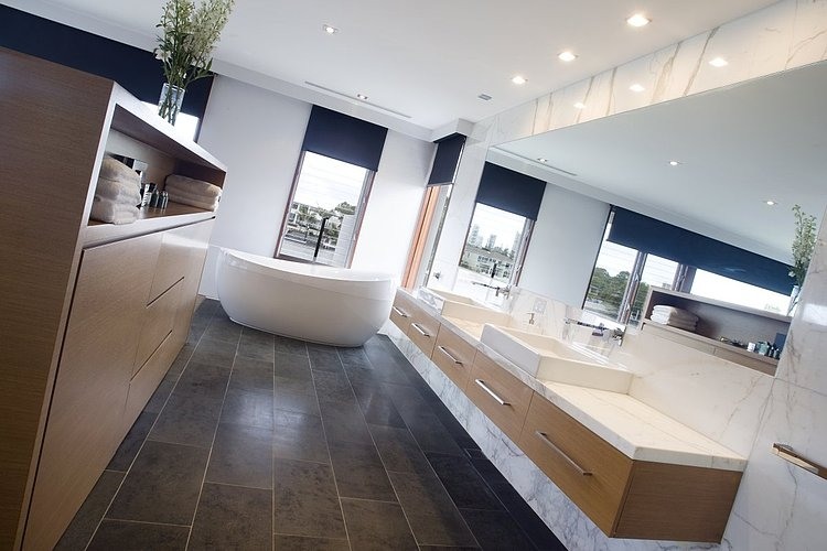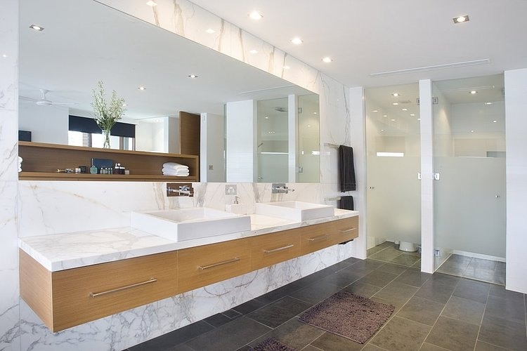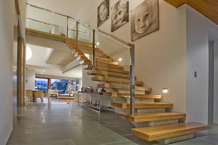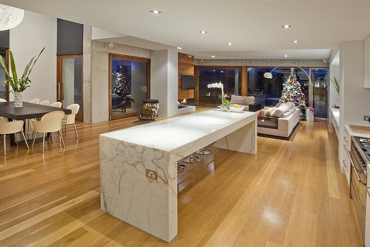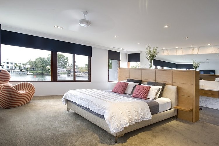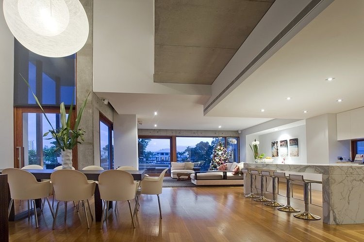 Journey towards the entry takes you down through a portico to the side of the site, formed by a series of crisp recycled timber columns. This leads to a 2 metre wide pivoted entrance door in the centre of the plan. Opening up to a low timber lined ceiling hallway, it soon uncovers an elevated 2 storey area perpendicular to the river. Here, visitors are instantly exposed to the exaggerated river view, sweeping from the southeast to southwest including the Broadbeach skyline. In the centre of the residence stands a set of captivating staircase that features concrete stringer and cantilevered timber treads. Internal spaces continue with the mixture of materials, where the raw structure has been left exposed in places to contrast with the more refined applied finishes of marble surfaces, bluestone flooring and blackbutt timber.