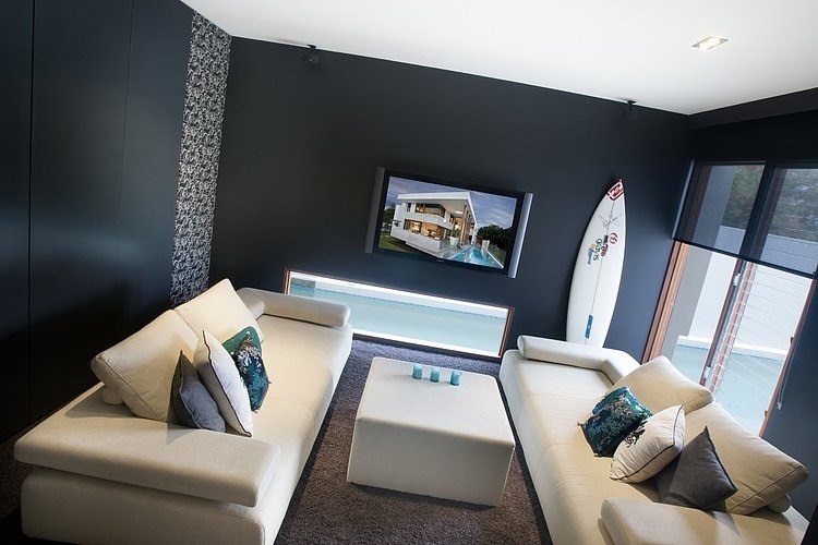 Open planned living zones are on the lower level while the upper level is reserved for bedrooms. Separated by the entry void, upstairs is divided into two wings, defining adult and children space. The children’s wing can also be completely closed off, while their balcony to the street front acts as their activity deck. Fixed with aqua, blue and white louvres, privacy from the public can be controlled. Simultaneously this allows cross ventilation and Northern daylight to penetrate through, creating a magical and colourful space for the restless youths. This experimentation with coloured louvres expresses the relationship between water and the property. At the same time it gives the junior boys a sense of ownership of the space filled with their favourite colour.