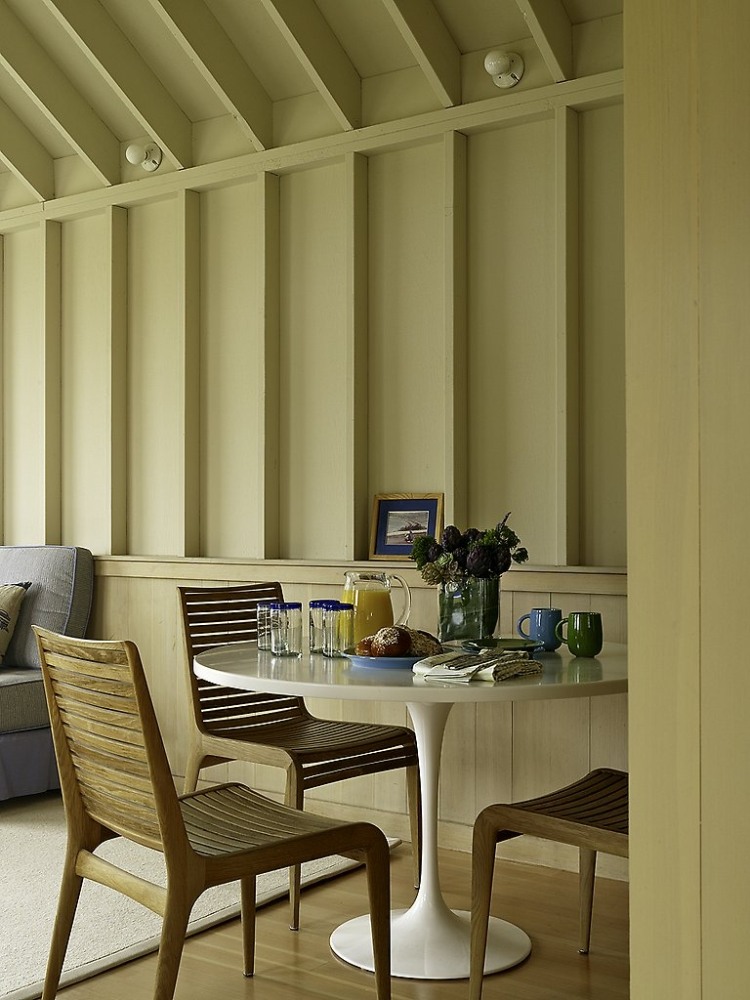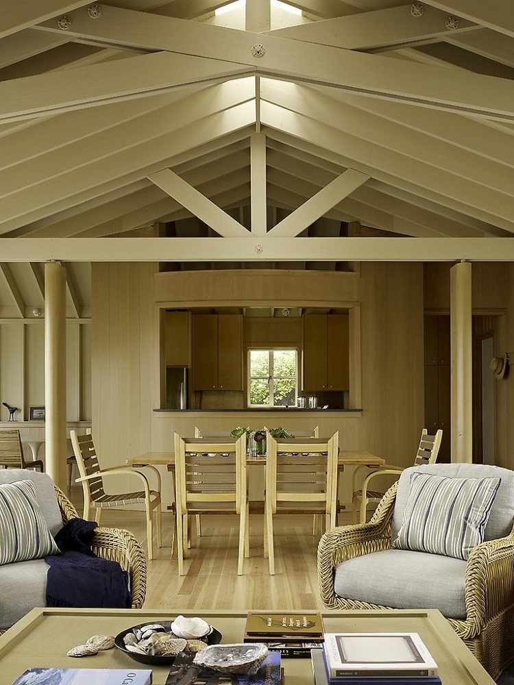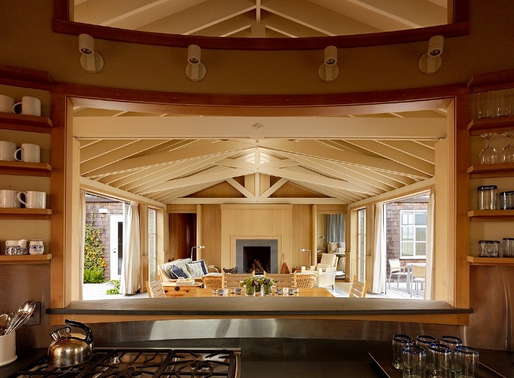 In 1950 a family bought a lot on the ocean at Stinson Beach in Northern California, but it wasn’t until 1982 that they began to plan a house for three generations. Besides the natural challenges of the coastal environment, there was the additional requirement of having the house carry forward the spirit of a William Wurster designed house built for the same family in Santa Cruz in 1935. The William Wurster house was well known as his only real courtyard house, and also for the large outdoor living room that was very unusual for its time. The plan evolved into an H shape, with a living room at the center, and the wings creating outdoor spaces facing both the Pacific Ocean, and the coastal range, in either direction. Rather than having an outdoor living room, the traditional living room has large sets of sliding doors that open to a position that matches the adjoining windows exactly, creating a distinctly outdoor experience. Depending on the weather, the doors can be open to the ocean, mountains, or both which provides great flexibility for enjoying the outdoors, indoors. The framing of the house is left exposed to the interior, which draws on the construction techniques used in early California beach houses where temperatures do no fluctuate in the way that they do in the valleys, and of course before modern building codes. The insulation was added to the outside of the framing at both the walls and the ceiling rather than in the wall cavity itself. Vertical grain fir wainscot hides the wires and pipes below the three foot level at the walls, and is used as flooring as well. Other materials are red cedar shingles, aluminum double pane windows, bluestone used at the courtyard paving, fireplace and countertops, and Alaskan yellow cedar at the wood terrace on the ocean side of the house.