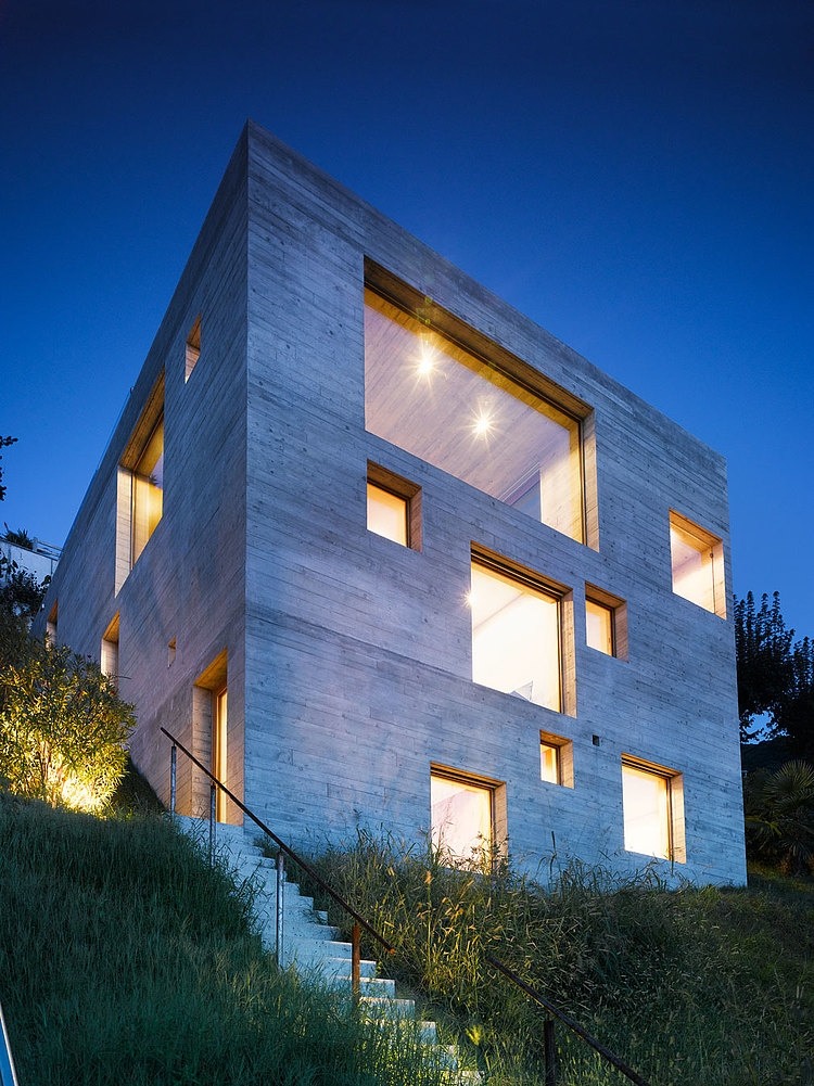 This modern 1,593 sf concrete residence designed by Swiss Wespi de Meuron Architekten is situated on a steep slope in Sant’Abbondio, Switzerland.