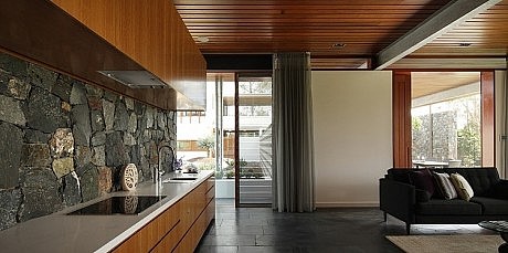One Wybelenna was a house born out of a remnant of a Robin Gibson cottage that existed on the site and was a bit of a landmark in the area. The design, inspired by the work of both Gibson (and Neutra in turn) is a contemporary re-interpretation of the modernist language and remains a narrative throughout the design down to the “corb” fireplace. The house enjoys a long, linear plan with all rooms designed to soak up winter sun and give direct pool and garden access for the long summers. The house, despite its size, has a strong sustainability agenda and includes turf roofs, 140,000L of water, 15KW of solar power, recycled materials (stone and timber) along with all the first principal design ideas that one would expect. A natural palette of zinc, tallowwood, slate and travertine create a robust aesthetic that aims toward a timeless architecture.