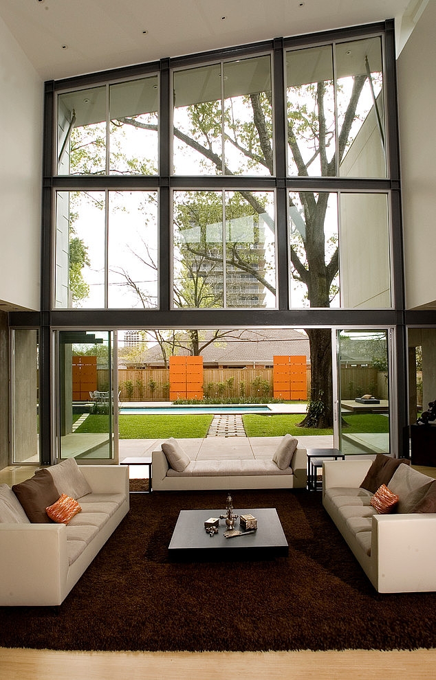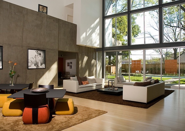 Conceived as a covered courtyard, the central great room of this modern Houston home is anchored by two arcing cast-in place concrete walls and a roof which seems to float overhead. Infused with light, air, and openness, the house allows the entire family to celebrate connections to the environment, their Indian heritage as well as modern life. This home infuses spiritual character into everyday living through thoughtful integration on Hindu details and elements of nature.