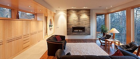 Unfolding like a strand of pearls from west to east across a steeply descending slope, this energy-efficient and sustainable home commands expansive winter views from its lofty ledge high above the north bank of the Zumbro River. Designed as a series of three linked pods, one each for garage, dwelling and retreat, this collection of sun-drenched forms strikes a quiet and respectful pose on this naturally wooded site.