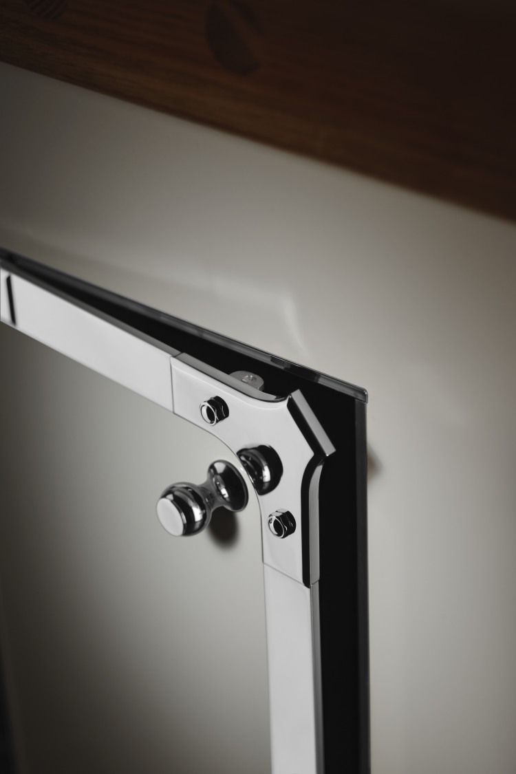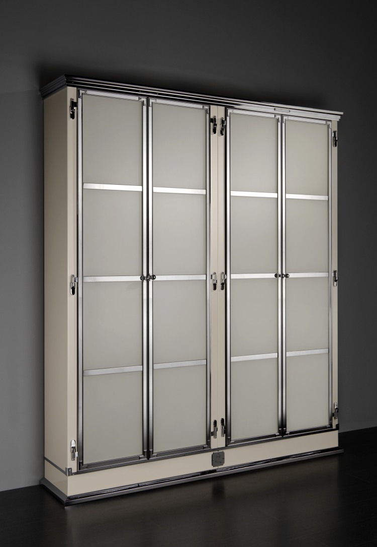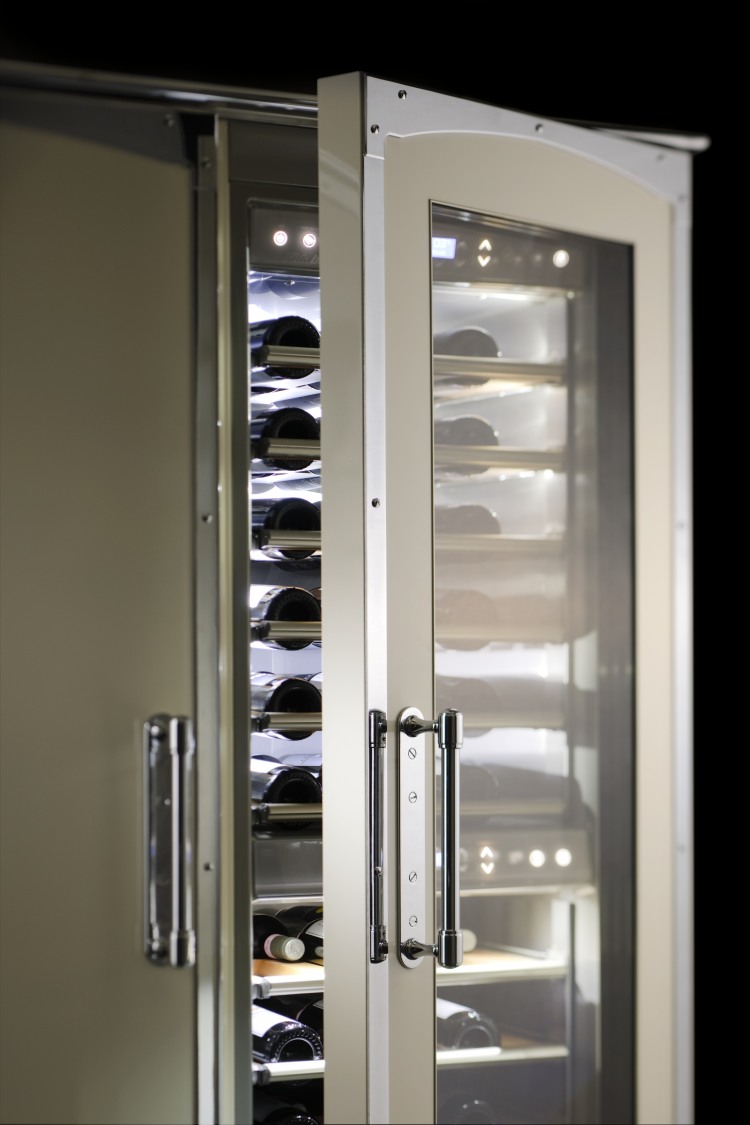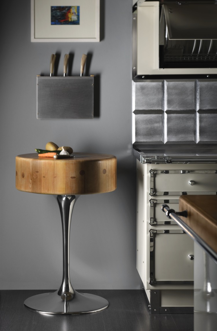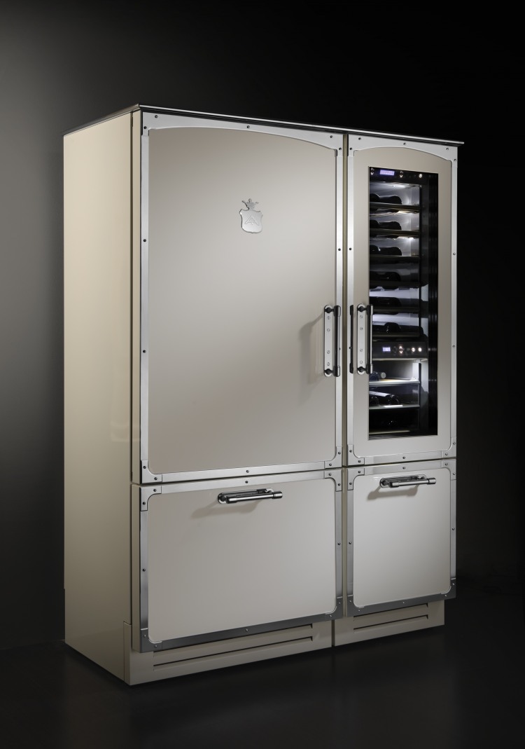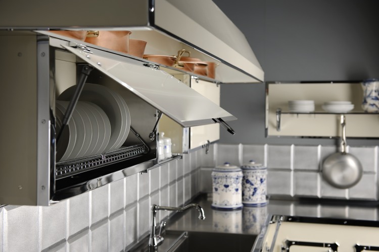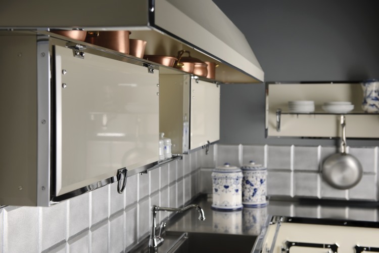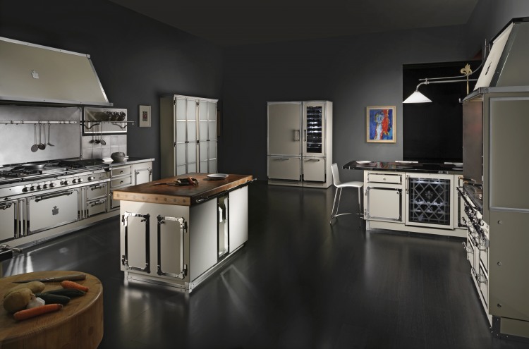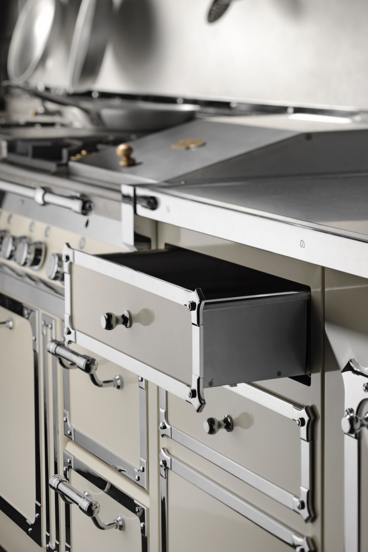 Kitchen in enameled stainless steel, in pearl white and chromed brass details, combining old world feel to modern design, featuring our professional grade cooking range. Our kitchens can be done in over 600 colors and the trim in 3 finishes, the cooking elements options are huge and anything can be custom made to the clients desire.
