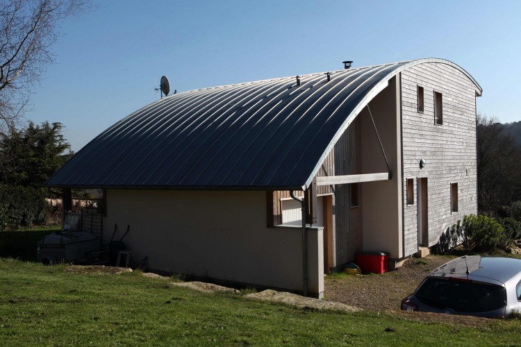 This house built of wood was dreamt up in 2007 and finished in the spring of 2010. The owners wanted to build an ecological dwelling with an arched roof at SAINT NOLF in the Morbihan. They bought a plot of land on a relatively steep slope in a verdant valley on the outskirts of the village.