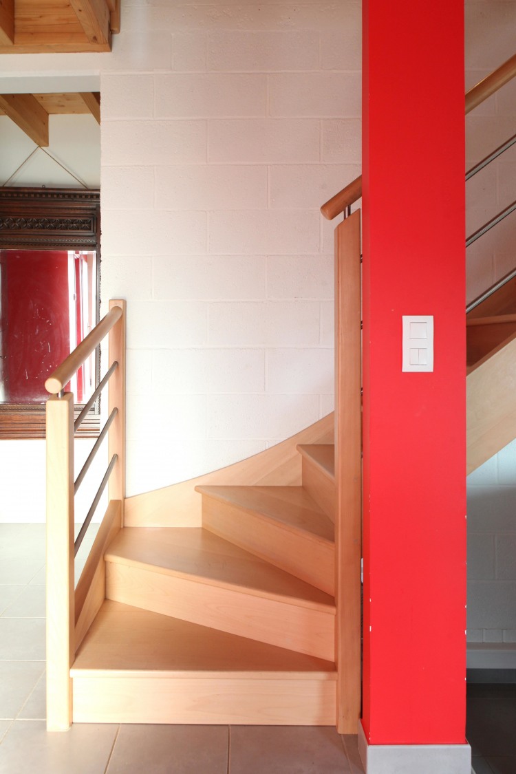 The ground floor is on two levels: on the lower level, the red-walled hallway leads to a bedroom with adjoining bathroom, a storeroom and the door to the garage; the kitchen and living room are on the upper level. The ground under the garage has been excavated to create a wine cellar. On the first floor are four bedrooms, a bathroom, a mezzanine and an attic. Sliding doors between two of the bedrooms and the mezzanine make it possible to modulate the sleeping area.