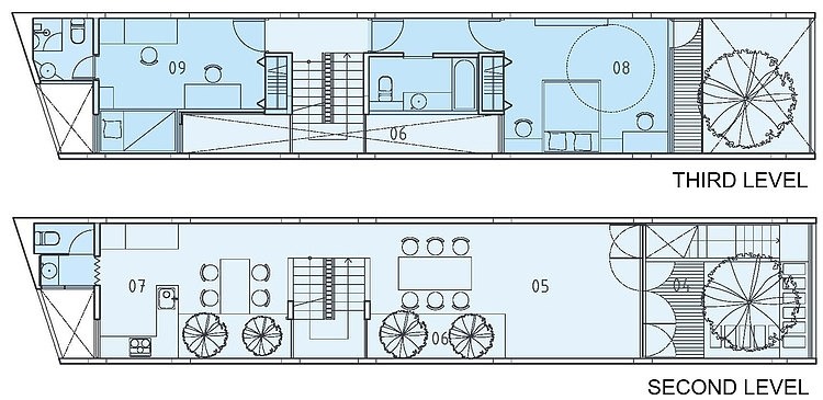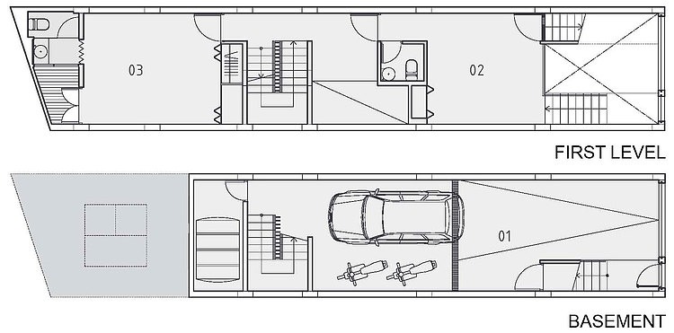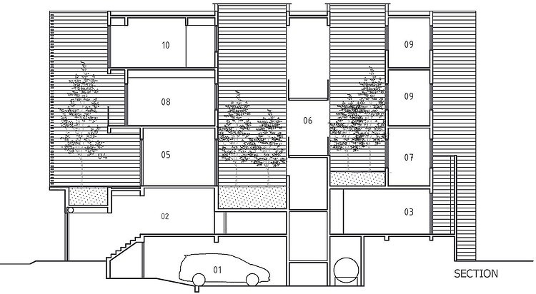 Greenery is located inside this “intermediate space” including 3 Babylon gardens provided with medium height trees which are about 4m (13ft) higher than ground level. These gardens filled with sunlight and winds bring in the relaxing feelings for the people and shorten the distance to nature which is quite difficult for townhouse. Unifying the whole space with the “intermediate space” helps people living inside to enjoy these gardens wherever they are within the house. Sub-functional spaces such as garage, storage, technical rooms are located in the lower part of the house attached but separated with the actual living space which is located in the upper part to get close to the outside atmosphere. Natural ventilation and lighting helps reducing the energy effectively.