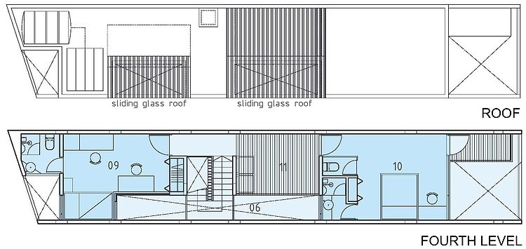 The house is 4m (13ft) wide by 20m (66ft) long including 1 semi-basement, 1 mezzanine floor and 3 stories above constructed by RC frame and brick walls with a total of 238sqm (2562sqft) floor area. The concept is to create an “intermediate space” connecting all other functional spaces, this open space is either courtyard, internal void or common space semi-opened to the outside while semi-closed in other to protect the necessary privacy of the residence. Louver Façade and Sliding Glass roofs area designed to maximize the connection with outside environment overcoming the limitation of getting in touch with the outside for such long and narrow townhouse. Other more discrete areas such as bedrooms and bathrooms expose to this “intermediate space” through the internal void running throughout the house. These spaces can be opened or closed whenever necessary.