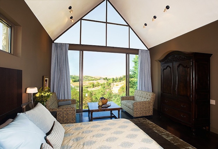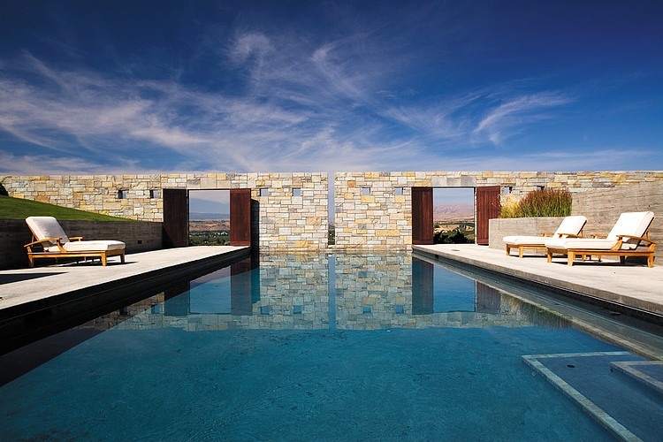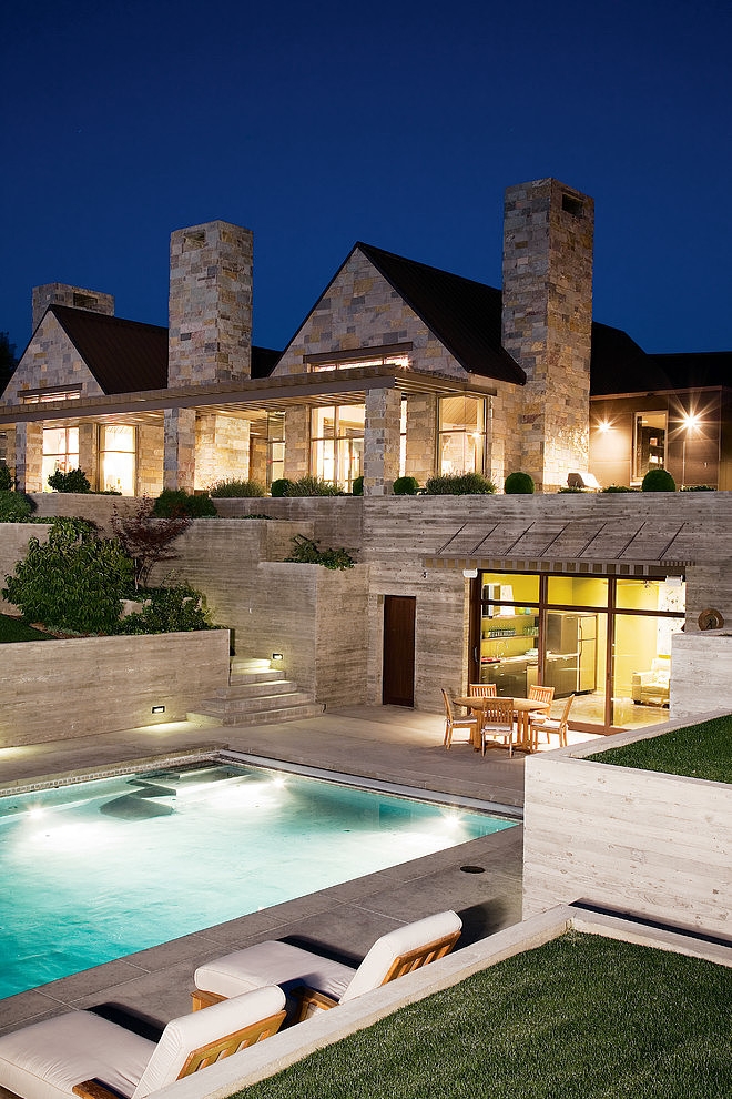 This home is located on a plateau surrounded by orchards and farmlands. Two intersecting diagonal axes were derived from the orientation of primary mountain views. A dramatic eighteen-foot, glass-covered concrete drum, located at the intersection of the axes fills the home with natural light. Stone clad gables stripped of all unnecessary detail enhance the drama of the gables and strengthen their rich association with nearby agrarian building forms. A stone wall shields the pool and cabana from prevailing summer winds while strategic openings focus views on the landscape and the mountains.