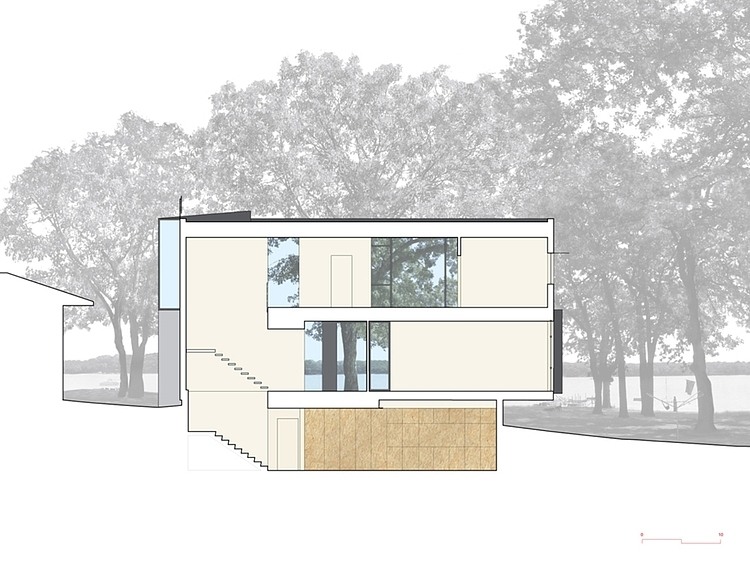 “It’s all about the lake,” was our clients’ direction when we began designing this vacation home in rural Iowa. Located in rural Iowa, Lake Okoboji is a part of a glacial lake system surprisingly located amidst endless cornfields, 2.5 hours from the nearest metropolitan area. The house sits on a diminutive lot on the dense shoreline where old cottages and new McMansions sit tightly together. Our strategy resulted in a deceptively simple footprint that minimized the size of the house on the site while allowing for a series of spatial frames within the house that focus on the view while excluding the neighbors. This allowed for a sense of total privacy within the house itself. Additionally, the lake itself is ringed by numerous oak trees which form beautiful a canopy around the lake, separating it from the corn fields.Volumetrically simple from the exterior, opaque and slatted vertical Ipe clads a stacked set of spatial tubes (the primary living spaces) that are open to the lake and woods views, but visually closed to neighbors on the sides. We formed the house’s spatial tubes around view axes running through the site, perceptually linking the lake through the forest to the fields beyond. These view-framing tubes are literal voids in the mass of the house bounded at their ends only by glass. Light and air also enters these rooms through operable windows set behind the slatted Ipe cladding. Dense service spaces (“program solids”) fill the remaining volume. The first level is dominated by continuous subtly amorphous space that opens to the exterior in with lake views in several directions. This space bounds the primary living spaces while suggesting connections and extensions to the surrounding landscape, lake and sky.In contrast to the spatial tubes of the public areas, the smaller private spaces (bedrooms and bathrooms) are treated with a pronounced sense of interiority. As spaces become increasingly intimate, the intensity of color increases as well. All interior surfaces in these rooms are subsumed by intense color to the extent that each feels like a zone of pure color. Here color becomes equivalent to the Lake that dominates the spatial tubes, providing and autonomous interiority in contrast to the site-oriented “tubes”. Color becomes an important tool of space making, an additional layer that can reinforce or contradict the other components of spatial geometry, intensifying the experience or adding complexity.In addition to the house and site, we were also responsible for all furniture, fabrics and finishes in the house. We selected and supplied most of the furniture, designed window coverings and selected custom fabrics for many of the furniture selections. We designed and fabricated several feature tables for the house, including a custom, CNC-milled cabinet for the master bedroom.Materials & Systems:Wood-frame construction with steel structural frames, cast-in-place concrete walls, blown-in & rigid insulation, and hollow-core concrete slabs. Exterior: concrete, sustainably-harvested Ipe cladding, aluminum composite panels, aluminum curtain walls, windows and doors; Interior: integral-colored concrete topping slabs with in-floor radiant heat, formaldehyde-free sanded/sealed OSB, custom-colored eco resin, polycarbonate, plastic laminate, Baltic birch plywood, painted steel, stainless steel, with commercial & custom furniture & fabrics by the architects.
