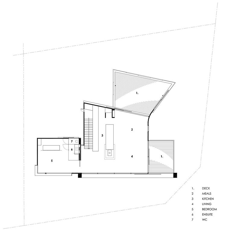 Entry to the residence is from beneath one such cantilever, through a Gallery space that leads to a staircase and up into the open plan kitchen and living area. The lower level is reserved as sleeping quarters for family and guests. Decks to the north and east branch off the Living area. Sliding timber screens wrap around the Northern deck providing privacy from neighbours and shading from the sun, with the added benefit of beautiful patterned light being cast internally. Internal linings are drawn outward, with sustainably grown Hoop Pine plywood ceiling panels evolving into external soffit linings. The owners also entertain on the eastern deck, enjoy the coastal views and remain protected from the harsh winds by a massive south facing glazed sliding door. The Master Bedroom sits adjacent to the Living area and enjoys elevated coastal views and the first glimpses of approaching visitors.