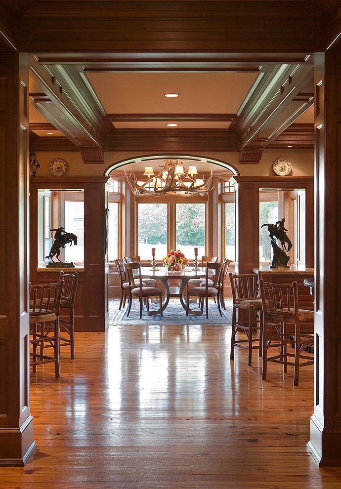The client’s program called for a separate home office wing in addition to an extensive array of programming elements. As a result, a portion of the client’s previous house, which had existed on another part of the site, was moved and integrated into the new structure through an entirely new exterior appropriate to the new construction. The program additionally called for large public spaces for the client’s frequent philanthropic arrangement of spaces with an open flowing circulation juxtaposed with smaller, more intimate areas. Picturesque massing is used to diminish the perceived size of this large house, and the discreet placement of the various wings ensures that one cannot take in the entirety of the structure from a single point. The entrance elevation is anchored by a stone stair tower with a continuous expanse of windows above the surrounding eave line., and a bell-shaped, lead copper roof. The south elevation, which is primarily viewed at a distance, is a much more sweeping, symmetrical composition. Traditional New England materials are used throughout the exterior and interior of the building. The exterior is rendered in a relaxed agrarian aesthetic reminiscent of earlier New England “Gentleman Farms”. The interiors o f the house are finished with traditional colonial revival details and proportions appropriate to the period evoked by the exterior.