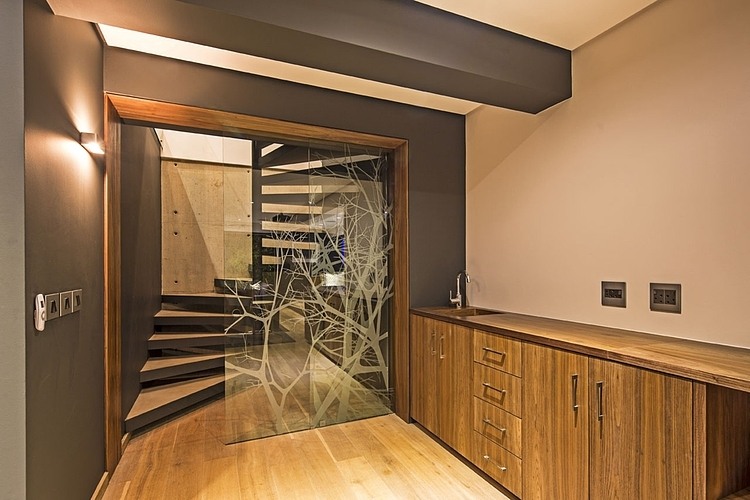 The extensive use of water in the design of the home includes a 25 metre lap pool with a glass panel between the water and the basement cinema room, and a shallow but expansive reflective pond on the approach side, which mirrors the building day and night, and evokes a sense of tranquillity.