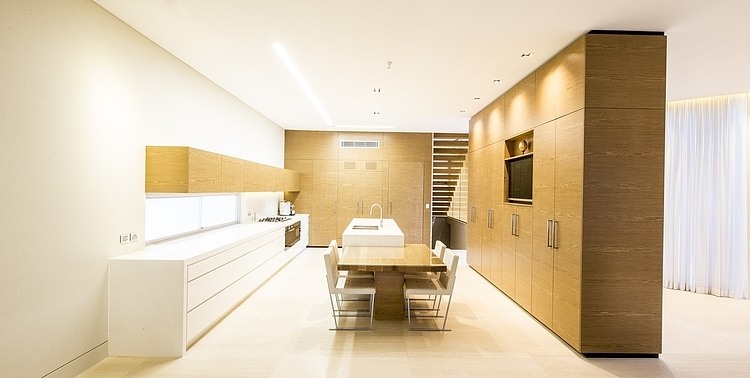 The client, who is also a structural engineer, has good working rapport with the architect which contributed to the success of the built by providing unconventional structural solutions. The suspended concrete slab and roof parapet wall has been constructed with single pour of concrete to ensure no construction joints visible to achieve seamless exterior finish. The interior also feature a custom built cantilevered staircase tread with welded steel plates finished in warm American White Oak which seems befitting with the sand stone wall.