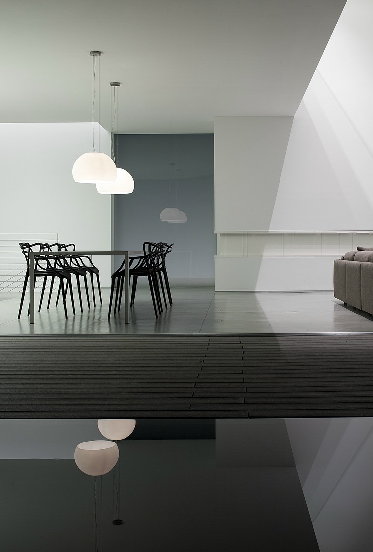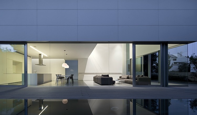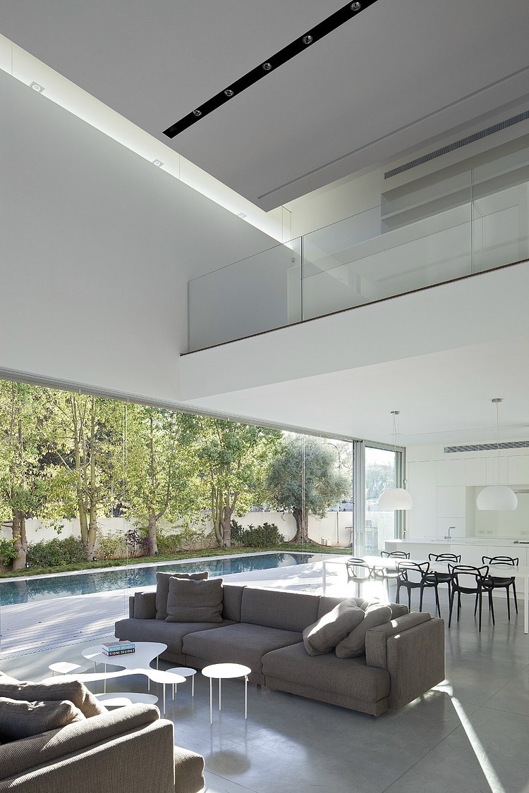 Appearing to effortlessly float above the ground, the G House advances the firm’s residential design beyond a purely minimalist approach. The G House is horizontally expressed but uses vertical space and light in surprising ways. The simply shaped residence on a small half of a dunam lot is organized along a horizontal framework which contains two living levels and a basement. The main level features copious glazing which opens to a private yard and pool; it is the entire wall of glass that creates the illusion of a floating building. The roof itself hovers above the house, separated by a slim glass window line.The main living space is accentuated by a large two story vertical open space creating interior relief and spaciousness. It is, however, the vertical “slice” along the street side façade that introduces an element of surprise. The “slice”, containing stairs to all floors, is punctuated by a linear skylight and a ribbon window that dramatically illuminates the stairwell. The result is a spectacularly unifying element in what would have simply been the backside of the building.The overall feel of the house is open, delightful, and harmonious in its details.