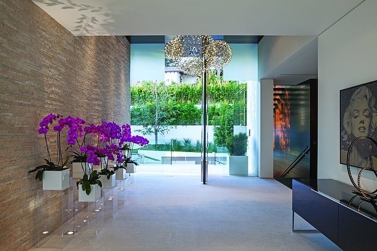 The front entry steps lead to a 14 ft. wood pivot door flanked entirely by glass, and then into the main floor foyer. To the left, a section of glass flooring reveals a wine room below with storage for 1000 bottles, and cantilevered wenge wood stairs float upward to the bedrooms.