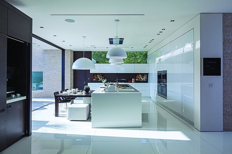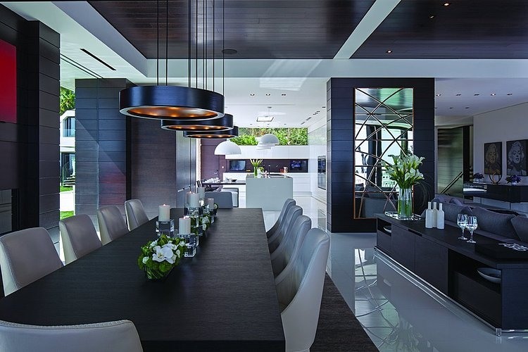 The living and dining areas are a study in chocolate and creamy whites carried through to the exterior surfaces achieved with Texston’s Lime based plaster, offset by rough split-faced stone and dark wenge wood. Lift and Slide German made Schuco windows and doors are state of the art offering dependable operation and drainage as well as thermal efficiency summer and winter. Glossy kitchen cabinets were custom designed and imported from Italy. “Zero edge” and “ floating” themes are echoed in the smallest details; kitchen cooktop venting is flush to ceiling. With no use of molding all lines are visible, every element must be perfectly square and aligned. Minotii, Maxalto and B&B Italia furniture was selected or custom made for each living space.