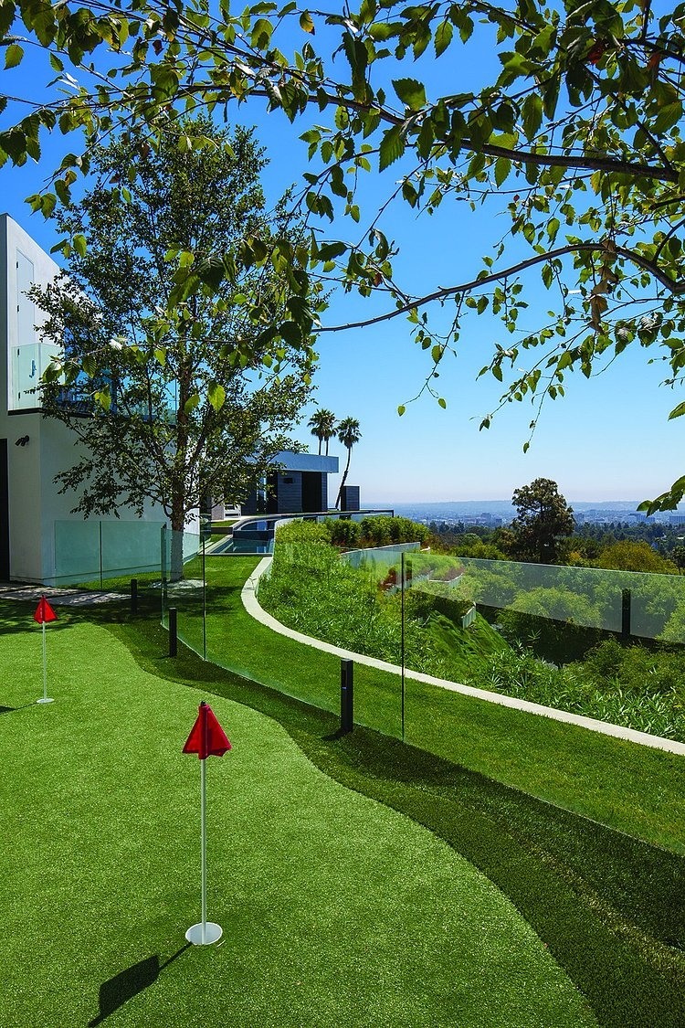 With the use of glass walls, the 5-car garage takes on the look of a classic auto showroom. Above it, accessible either by a walkway off the main house or privately though a glass enclosed spiral staircase, the spacious 2 bedroom guest house includes surround sound, television, writing studio, gym, and bar. Guests can enjoy their private deck and fire-pit, a view of the putting green, and of course the Pacific Ocean.