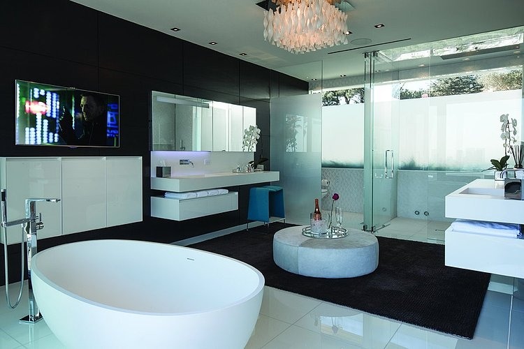 The main powder room’s motorized sliding glass door opens up to a vanity and white glass rectangular column – the sink. A wall of small, mirrored black tiles, reflect a single chrome vertical water pipe suspended over custom made sink.
