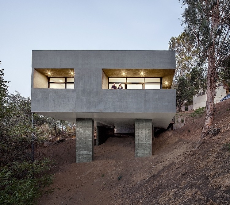 Because of the steep terrain the house is designed to float over the hillside. This reduces the amount of foundation required and also means that the only way to access the house is over the bridge – so it is truly a floating structure.