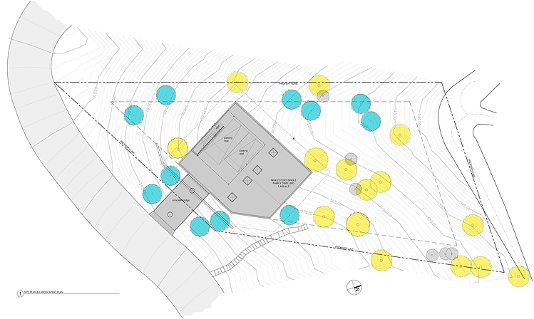 Starting with a vacant lot with a very steep down-slope from the street, the design of the house places the carport on the roof with the residence below. In addition to being a dramatic shift of expectations, it is also a logical response to the building code which requires parking for two vehicles.