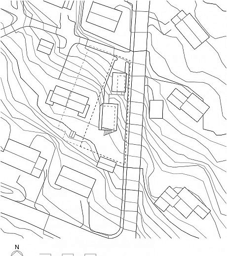 The shifted upper level of the house makes intricate spaces inside. The plan is really compact with various functions combined such as play area with hallway, guest with office space and kitchen and living room together. Angled walls and narrow spaces give specific solutions to a dense house.
