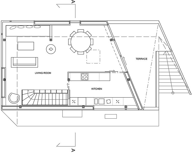 The shifted upper level of the house makes intricate spaces inside. The plan is really compact with various functions combined such as play area with hallway, guest with office space and kitchen and living room together. Angled walls and narrow spaces give specific solutions to a dense house.