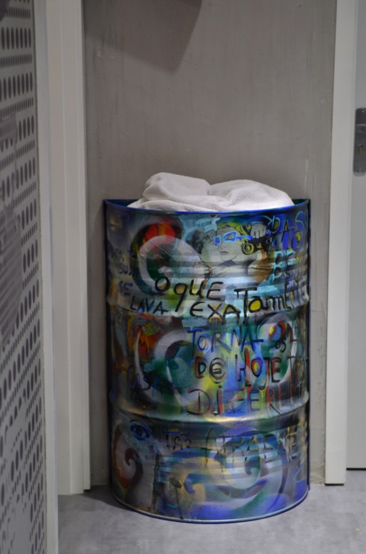 A recycled oil barrel designed by the authors of the project and painted by artist Lou Borghetti serves as a laundry hamper and adds some poetry to the space asking what makes a house feel like a home.