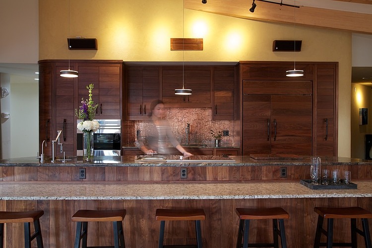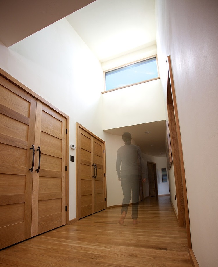 We nestled the house in the hillside, bending the floor plan to carefully fit the contours of the field. The slope of the hill faced east, however, and we knew we would need to capture as much winter sun as we could to naturally heat the home, so we extended the living and dining room out onto the crown of the hill, raising a broad bank of carefully shaded windows to the south to scoop in the sun.