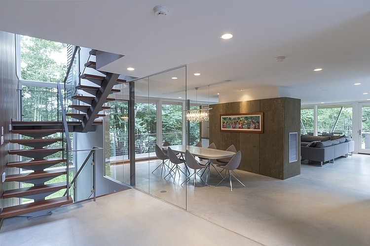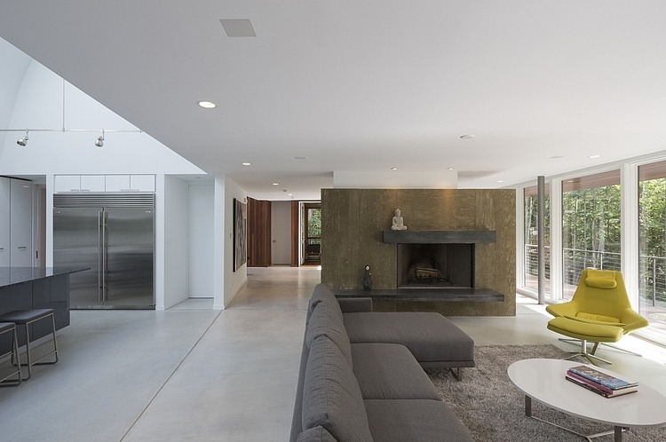 The house is designed to be economical both in construction and maintenance akin to the classic modern Case Study Houses of the last century. Green features include the use of recyclable materials, a closed loop geothermal heating and cooling system, and solar collectors to supplement the grid system. As much of the site as possible has been left undisturbed and restored to natural growth, and for preservation of the surrounding wetlands and wild flowers.