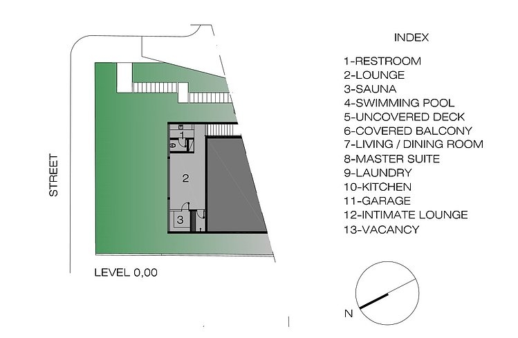 The house is organized as follows: sauna and rest at street level (basement), social area on the ground floor, 4 meters higher than the street, and private areas on the second floor.