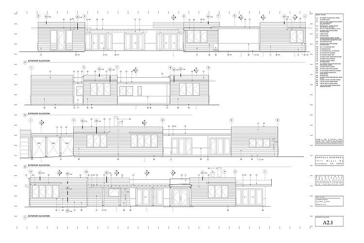 The new design presents spacious volumes with tall wood windows and doors allowing visual access to horizon, sky and hillsides in the foreground and distance. It consists of five new tall articulated wood boxes, which are an expression of important interior spaces within the building. They are connected by slightly lower roof and ceiling sections with trellis an walls of integral color plaster.