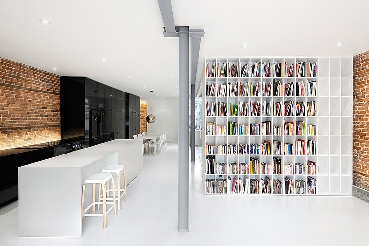 The open kitchen is the focal point of the space; it unfolds on the dining room and living room, where the master bedroom fits. It is bounded by a glass wall which preserves the view of the bare brick; an archaeological reminder wanting to highlight the existing raw materials as an exhibitor showcase. On the ground, a radiant hot water heating system was installed under a concrete slab, which was covered by a light gray epoxy and polyurethane matt finish.