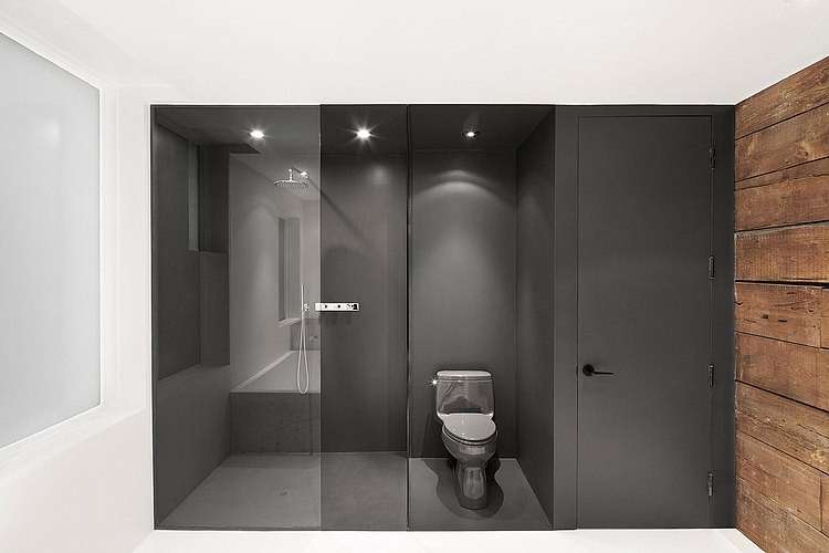 The steel beam, flameproof, delimits the passage area. In the corridor leading to the bathroom, a light-emitting diode was installed in the recessed ceiling for a more intimate setting, which features the original hemlock wall.