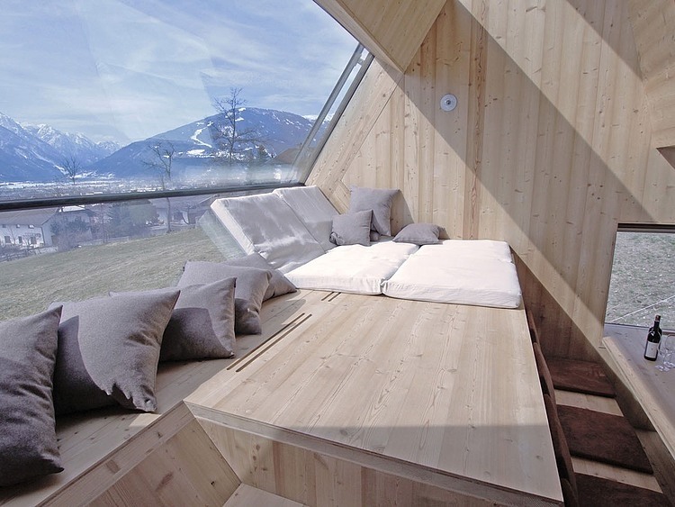 A compact building, made entirely of wood, both inside as well as outside. The smell of wood flows through the room. A generous, as the only access bridge-like connection to the seemingly floating building. Slippers are standing in the entrance area, almost like home. Following you will find the kitchen with sink and hob. A stove with optional hotplate complements the kitchen and spreads warmth throughout the house. The cantilevered table can comfortably accommodate 6-8 people. For more generosity, the seat can be folded down. The huge panoramic window connects Inside and Outside. Natural materials, coupled with quality products – the best of the region. Substances (Villgrater Natur), produces in East Tyrol gives more softness and comfort. Whether you relax comfortably, watching TV, playing, sleeping, cooking or just want to calm down – nothing seems impossibel. Upstairs there is a spacious double bed in pine, which can be transformed into a bed when needed. Another, separate bunk offers the special recreational value for two. An open glass cabinet with a view into the shower creates sufficient space for luggage. The barrier -free bathroom, overlooking the mountains of East Tyrol makes the shower experience. The Ufogel has a floor heating, which can optionally be supplemented by the stove. A refrigerator and a storage box with several areas are available. For hot summer days, a fully automatic sun protection system is installed, which can be operated manually (+ Aircondition).