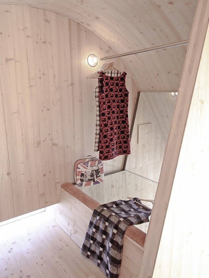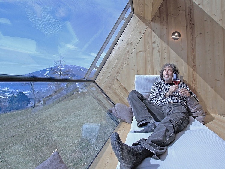 The Ufogel is the creation of an extraordinary and comfortably appointed house made almost entirely of larch wood. The structure takes its name from its form which sometimes bears resemblance to a prehistoric bird and sometimes to an extraterrestrial home, but is always something special. It’s certainly not a standard, off-the-peg house but more of a sculpture to live in, which reveals itself to be a “spatial wonder” the minute you walk through the door. 45 m2 of multi- functional living space, comfortably appointed with a kitchen unit, WC and designer shower. Large panorama windows bring nature indoors to you, while the curved timber structure covered with traditional shingles creates a feeling of warmth and security. Whether you sit, lie, shower or share a meal, two things are always present in an Ufogel: wood and the heavens. The Ufogel offers both openness and a sense of security. The large panorama windows bring the landscape indoors giving you the feeling you are still outside while the round shell conveys a cosy, woody feeling of security. This makes the Ufogel a refuge full of warmth and rustic character where you will sleep soundly with the feeling you have returned to the origins of the home.