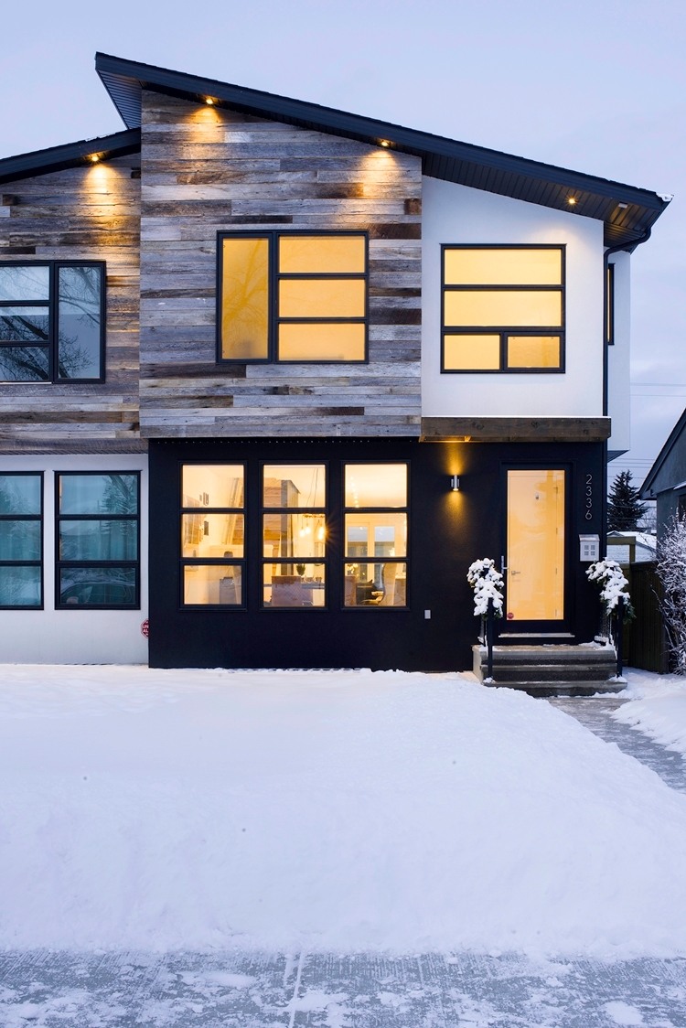 This semi-detached home was built by Beyond Homes and designed in collaboration with Building Bloc Design. The home features reclaimed barnwood siding and 150 year old elm barn wood floor. Each unit is roughly 1800 sqft and situation in Calgary, Alberta Canada.